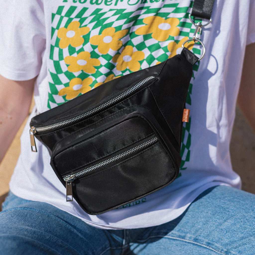 Riñonera de nylon negra. Dos bolsillos exteriores. Correa de polyester y raso regulable con dos mosquetones para intercambiar.